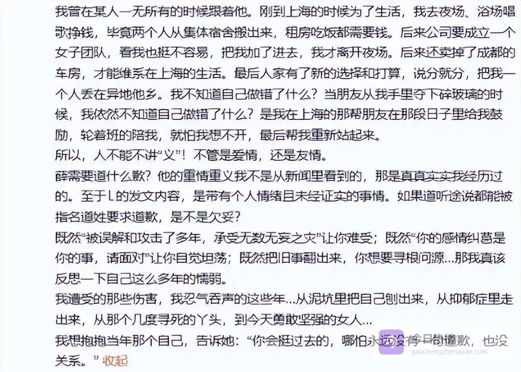 挺耐人寻味的,段曦在那篇长文里还特意为薛之谦站台,她提起当年公司最难熬的时候,是薛之谦一个人拼着挣钱养活一帮兄弟,情义满满,等到他最后一个解约离开,她暗示这样的有情有义的家伙,根本就不用去道歉。