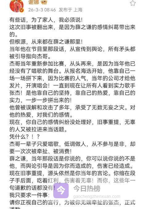 3月3日一大早,谢娜在朋友圈发了一篇长长的文字,直呼薛之谦的名字,要求他正式道歉。