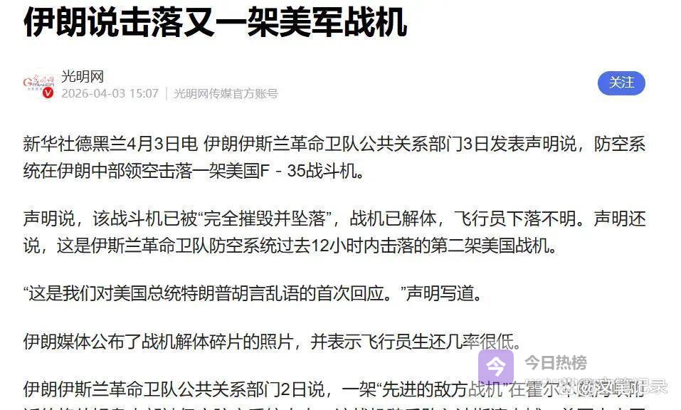 4月3日凌晨,它栽在了伊朗。伊朗说是我打下来的,美国支支吾吾说不清楚。但有一点板上钉钉:开战36天,美军“有人战机零损失”的神话,破了。
