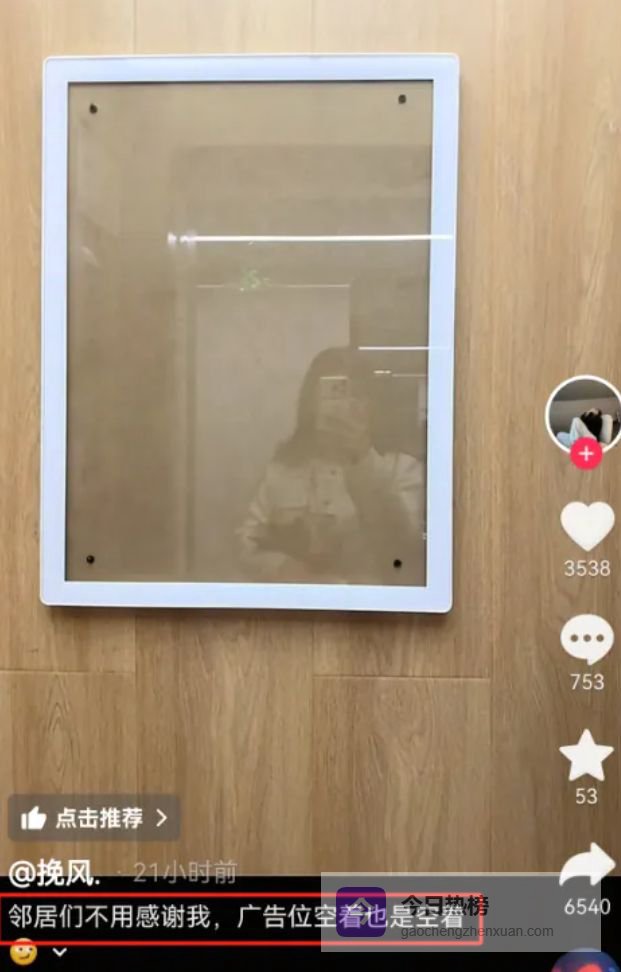 然后她脑子一转,发现小区的电梯是新装的,里面的广告栏空空如也,只有一个框,什么都没贴。