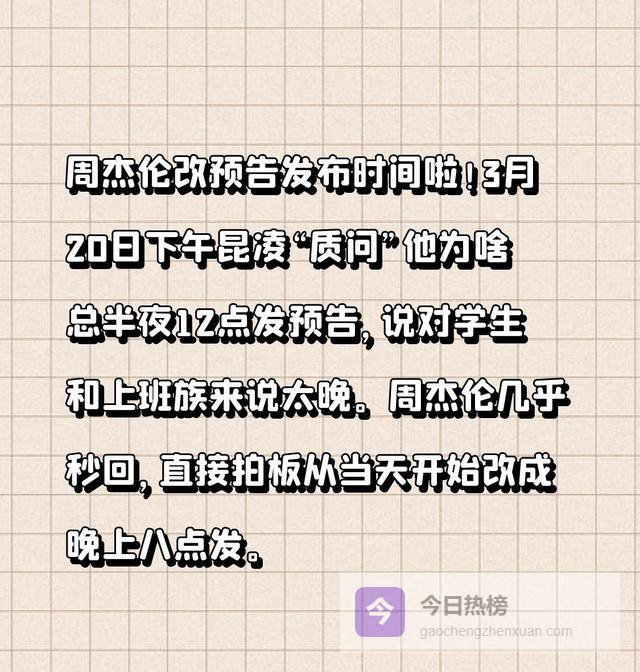 咱们先扒一扒时间线。2026年3月18日0点,周董第16张专辑《太阳之子》首支预告准时上线,这确实是铁打的“杰伦时间”。随后昆凌在抖音喊话“纳闷”,周杰伦口头回应“也可以早一点”。注意,是“也可以”,不是“必须”,更不是什么“拍板定案”。所谓的“硬生生改到晚上8点”,在公开信息里根本找不到官方实锤,这更像是团队精心编排的“公关剧本”。
