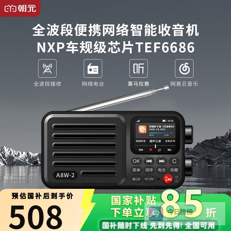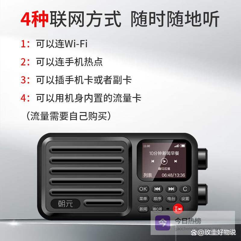 【商品推荐】1:朝元A8W2全波段网络收音机这款机型最突出的特点是四模联网能力落地扎实——它不只写参数,而是把WiFi、手机热点、Micro-SIM卡槽、内置4G模块全部做进同一套驱动逻辑里。插卡即识别,切热点不重启,连上后自动同步全国电台频率库。老人用起来特别顺:插上移动卡,打开就听《新闻和报纸摘要》,不用教IP设置,也不用碰APP配网。