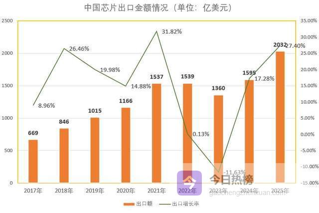 再说说出口。芯片造得多了,除了自己用,肯定要卖到国外去。2025年,中国芯片出口金额超过了2000亿美元。而2019年呢,大概只有1000亿美元出头。翻了一倍,增长了100%。