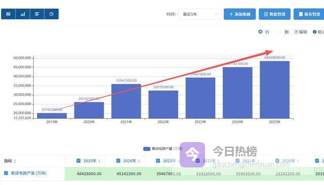 2019年,也就是贸易战刚开始那会儿,国内芯片产量是2018亿颗。到了2025年,你猜多少?4843亿颗!6年时间,增长了140%。