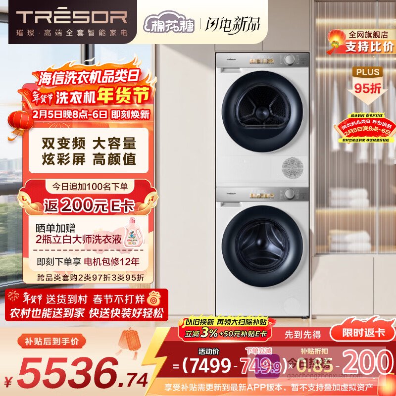 【京东自营】海信璀璨棉花糖洗烘套装12KG大容量滚筒单洗洗衣机+热泵烘干机HG12M5S+M5S以旧¥
