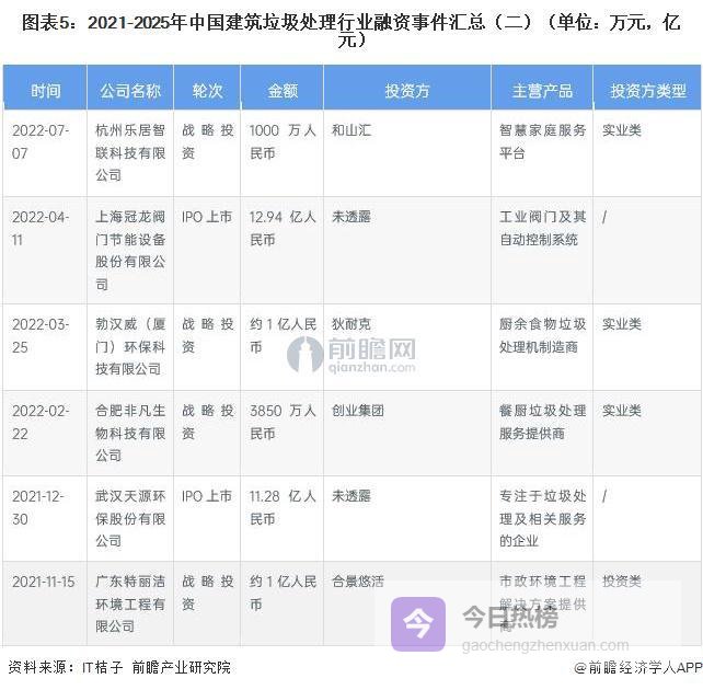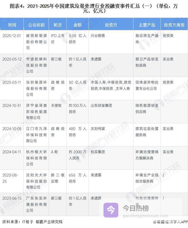 2021-2025年我国建筑垃圾处理行业的主要投融资事件如下: