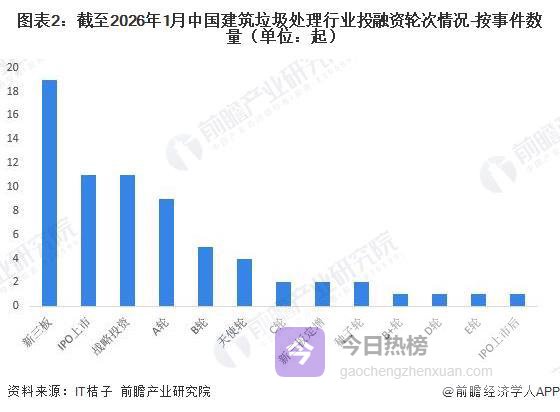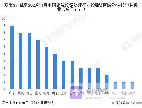 从建筑垃圾处理行业的企业融资区域来看,目前广东的融资事件最多,截至2026年1月累计达到9起。同时,北京、浙江、重庆等地的建筑垃圾处理投融资活跃度也较高。
