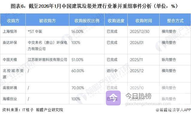 国内建筑垃圾处理行业发生兼并的事件较少,目前兼并重组的类型主要为中游企业横向整合。