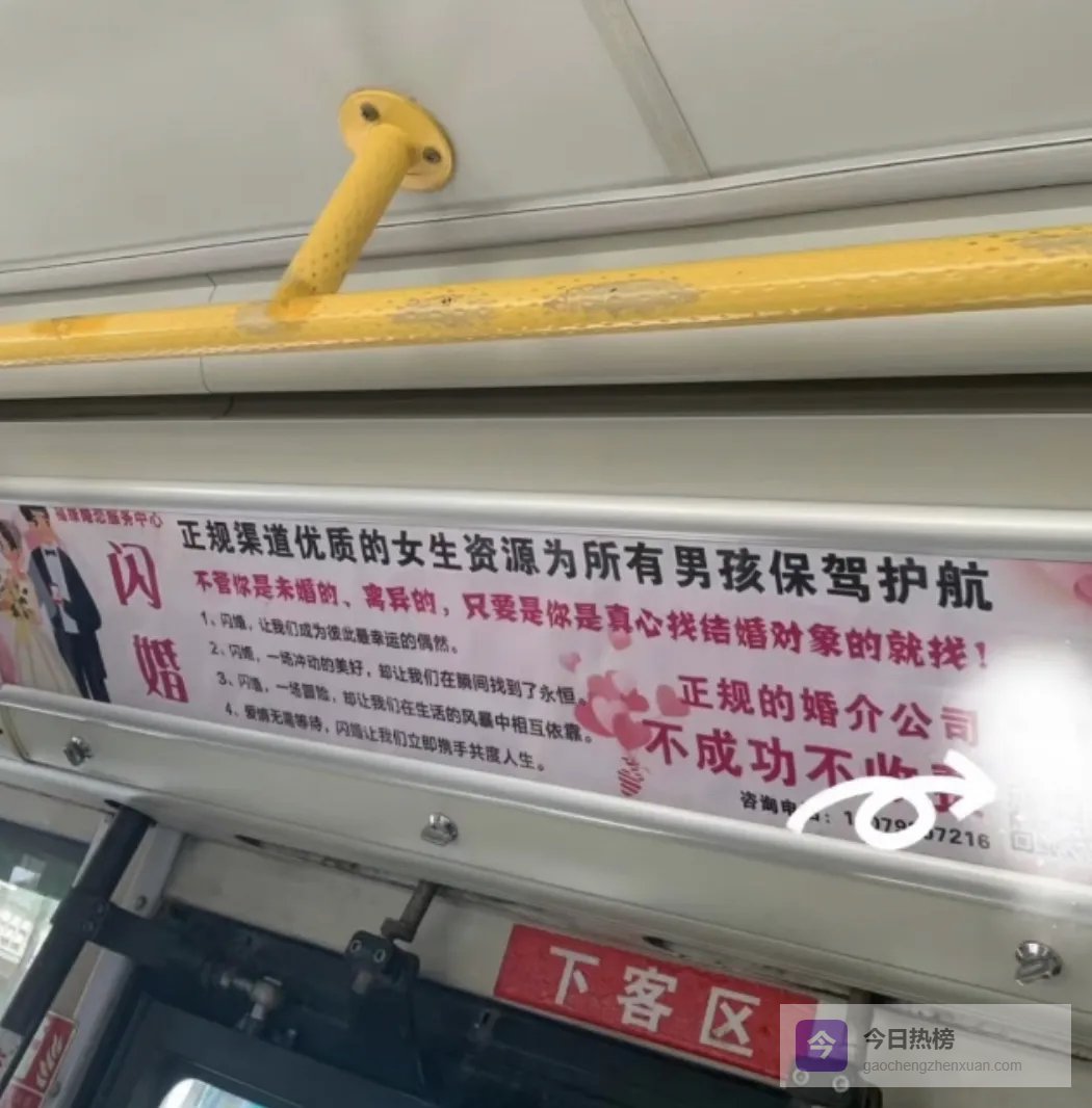 57日,江西九江市德安县一公交车内“福缘婚恋服务中心”的广告引发争议。广告中多次宣扬“闪婚”,并用醒目文字写有“正规渠道优质的女生资源为所有男孩保驾护航”的字样。不少网民质疑其物化女性,有违公序良俗。相关工作人员表示,该广告语确实不妥,当地部分公交车也确实张贴了该婚恋中介广告,已要求公交公司进行排查。(大皖新闻)