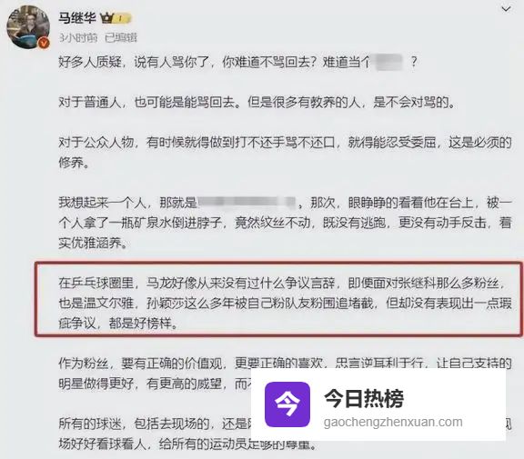 随着国乒在巴黎奥运会的热度越来越高,马继华也突然把注意力转到乒乓球上了,他的账号发的内容明显跟以前不一样了。