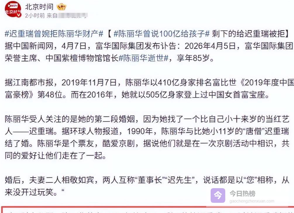 陈丽华的遗产早就分好了。 富华集团、长安俱乐部这些核心生意,全交给儿子赵勇和两个女儿打理。 而他们俩一辈子心血的紫檀博物馆,正式交给迟重瑞管。至于现金、房子这些私人财产,迟重瑞和三个子女一起继承。