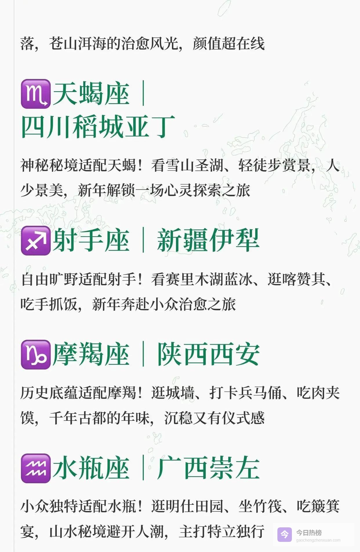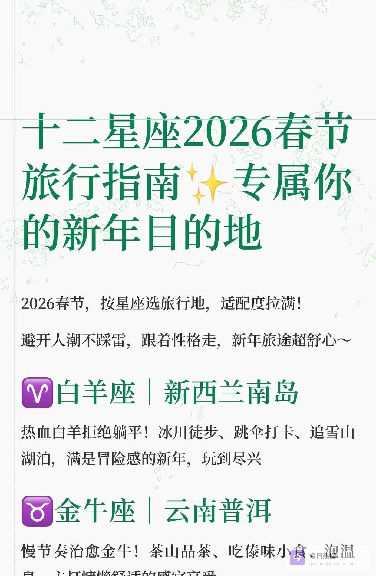 新年快到了,很多人心里都在盘算着要怎么开启第一场属于自己的探索。有人觉得应该热闹刺激一把,冲破一切平淡,迎接新年的激情;也有人想静静放松,找个温暖的角落,好好犒劳一下自己。其实选一个适合自己性格的地方,反而能让整个新开始变得更有意义。今天我就按照星座的性格特质,跟大家聊聊适合不同朋友的新年旅行方案,找到心灵的那份共鸣,开个好头。