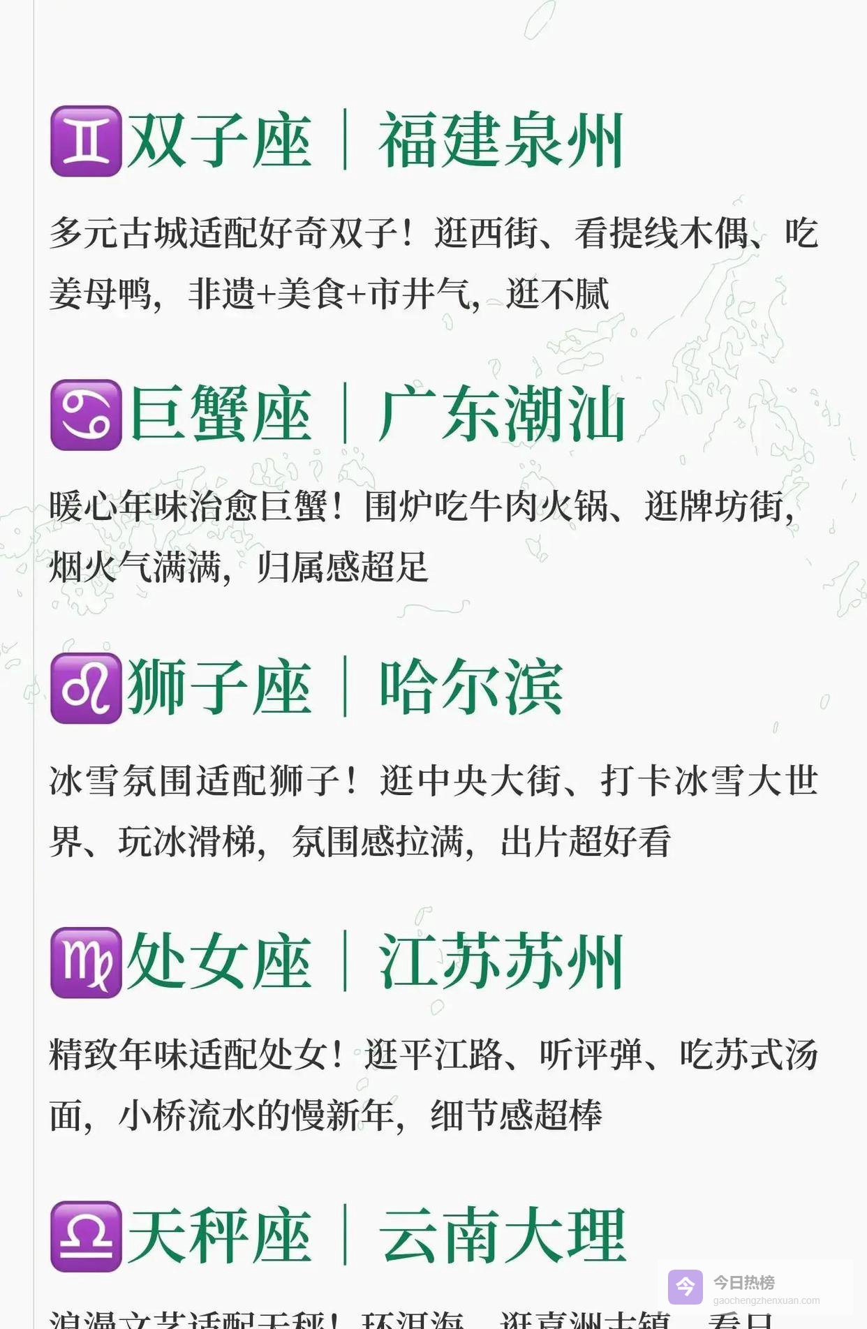 土象星座则喜欢慢工出细活,追求稳稳的满足感。金牛座的我,最爱云南普洱。那里的茶山风光一看就让人心安。静静地坐在茶园里,手中捧着一杯刚泡好的普洱,浓浓的茶香弥漫开来,味蕾瞬间被征服。喝着喝着,鼻子里能嗅到那股微微带有土腥味的陈香,真有种回到老家土坯房的感觉。顺便在街头巷尾转转,咬着馥郁的小吃,体验那种满满的生活气息,最舒坦的是找个温泉泡一泡,泡着泡着,整个人都放松了好几圈。处女座的你,苏州绝对不二之选。古色古香的桥街小巷,水汽袅袅,微风拂面,仿佛穿越到古代画卷中。慢慢行走,小桥流水、评弹轻扬,一碗地道的苏式汤面热气腾腾,入口还带点淡淡的酱油香,细节里都藏着匠心。每个角落都经过精心打磨,刚好满足你对美的追求。