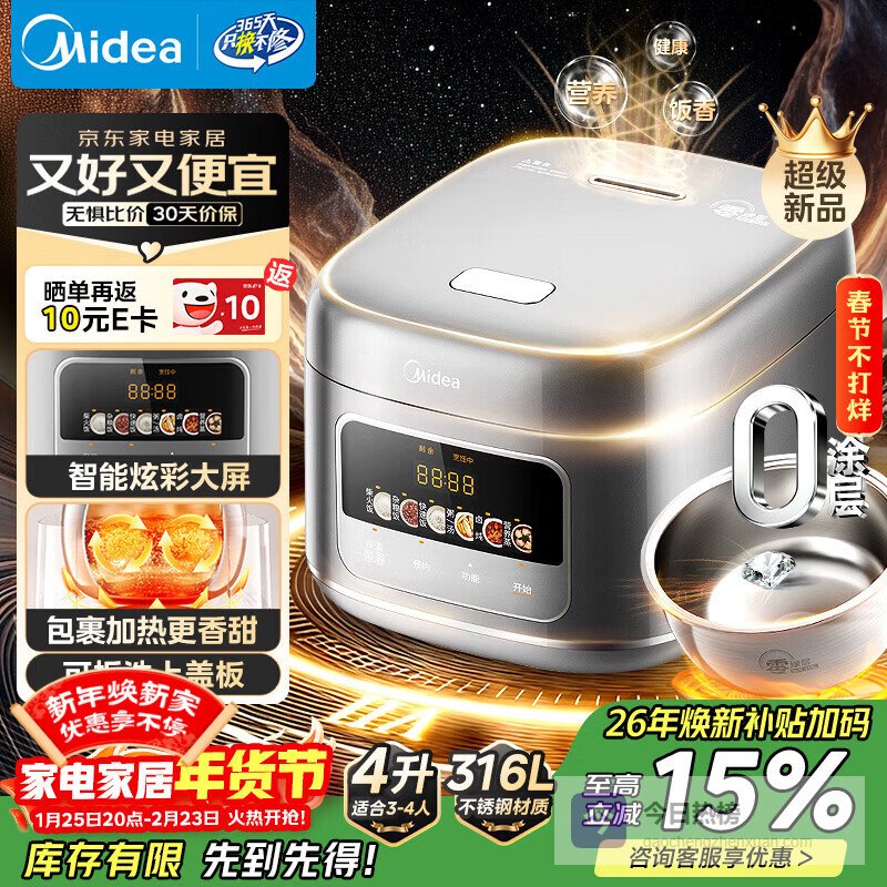 美的(Midea)电饭煲大布丁0涂层电饭锅4升316L母婴级不锈钢内胆3-4人家用多功能无涂层微压智能RE487S品牌官方¥