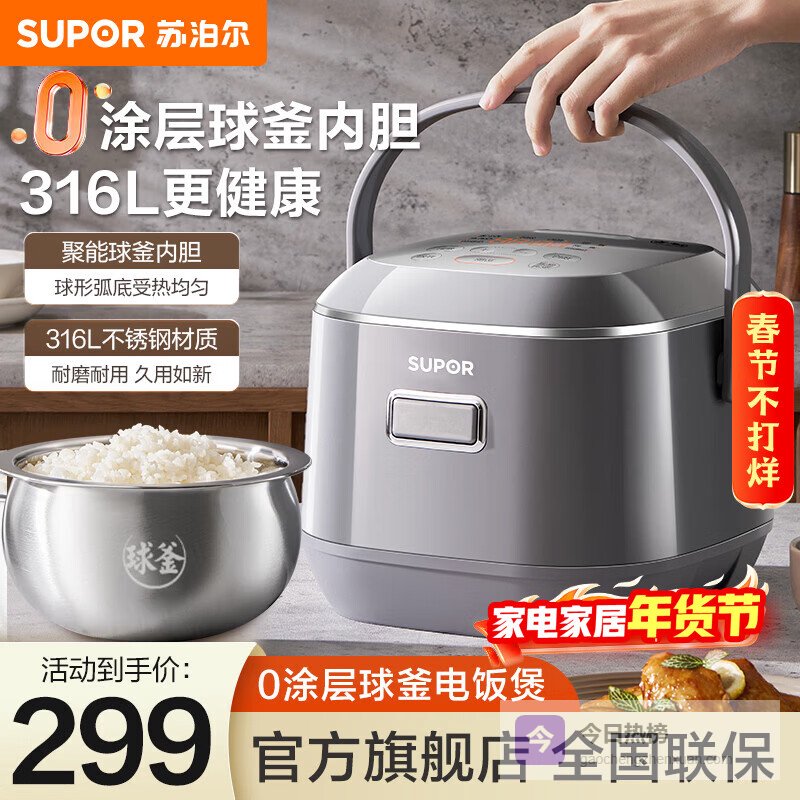 点评:这款电饭煲用的是无涂层内胆,让你用得更安心,不用担心涂层脱落污染食品。它还采用316L不锈钢材质,比普通材质更耐用、更安全,清洗起来也方便。有球釜内胆,设计成球形弧底,烹饪时米饭能充分翻滚,受热更均匀,锁住水分和营养,米饭的口感也更香软。容量正好2L,适合1到3人小家庭,煮一顿刚刚好,不会浪费食材。
