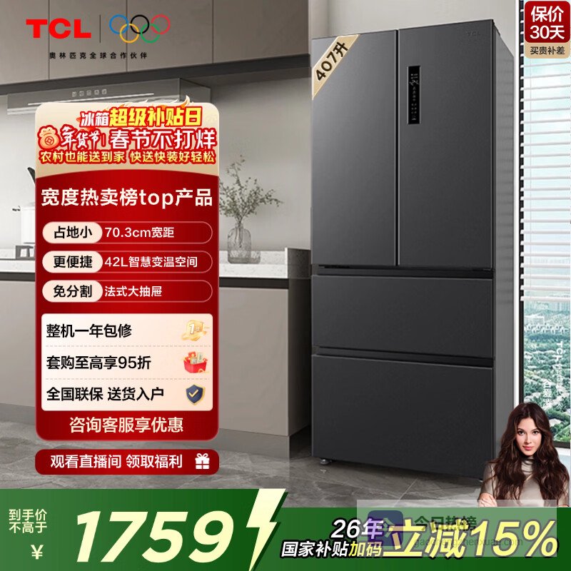 如果你对冰箱的功能丰富性和健康存储有特定要求,比如家中有婴幼儿,那么TCL这款407L法式多门冰箱值得重点关注。超过400L的容量足以应对多口之家的存储挑战,而其核心亮点在于独立的“母婴变温空间”。这个空间可以精准设定适合存放母乳、辅食、婴幼儿食品的温度,为宝宝的“口粮”提供专属的保鲜环境,对于新手父母来说,这个功能非常贴心且实用。