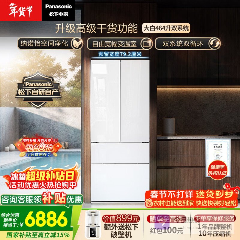 松下(Panasonic)大白464L法式多门冰箱家用超薄零嵌入式变频双系统风冷无霜一级能效NR-EW46TGB-W【国家补贴】¥