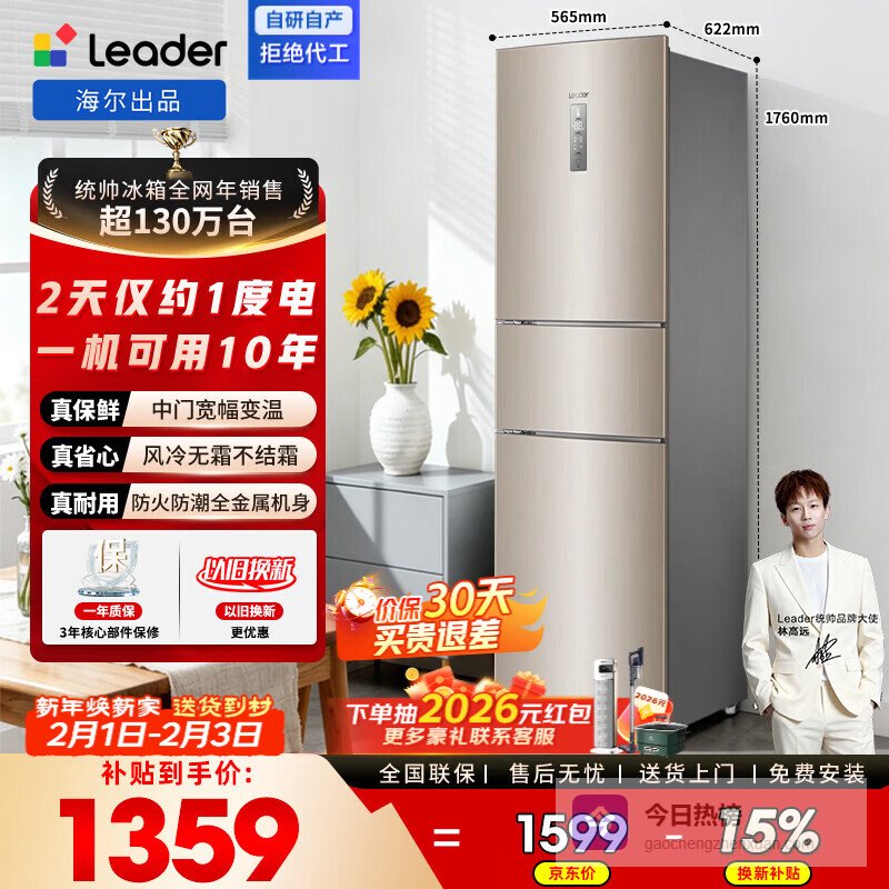 统帅(Leader)海尔冰箱出品218L三门冰箱中门宽幅变温一级能效风冷BCD-218WLDPPU1政府补贴15% 一级变频 宽幅变温 风冷无霜218L¥