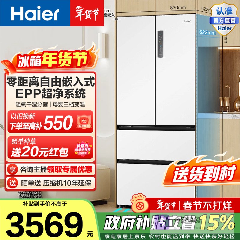 海尔(Haier)家宴500升法式多门冰箱零距离自由嵌双变频风冷无霜EPP超净BCD-500WGHFD4DW9U1政府补贴15% 500L法式-白|EPP超净¥