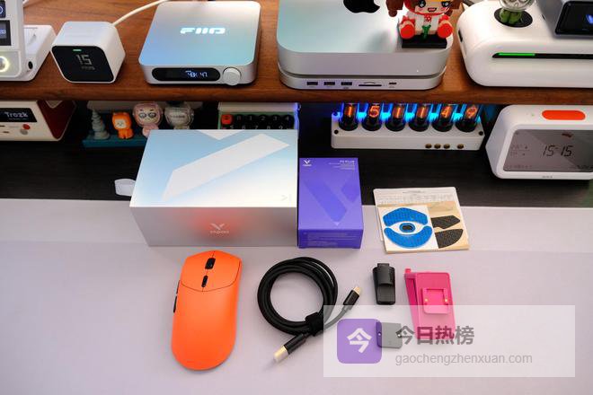 打开可以看到全家福,配件挺丰富,除了鼠标主体外,还有2.4G 4K无线接收器、脚垫贴、USB转换器、以及充电线和说明书。VT7的焰影橙真的长在我的审美上,不是那种刺眼的亮橙,是暖乎乎的色调,放在桌面瞬间提亮,不管是搭配电竞桌,还是普通办公桌面,都很有氛围感。