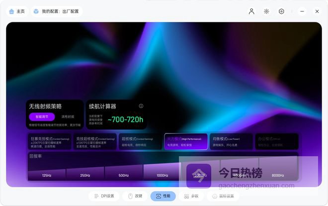 驱动界面很简洁但很专业,不用懂复杂的设置,新手也能轻松上手,还能保存多套配置,办公、游戏可以切换使用,特别方便。比如在性能设置方面,它有几种预设模式,可以选火力模式,均衡模式,超核模式等。另外,还支持持续OTA升级,可获得后续更优体验。