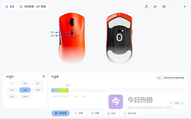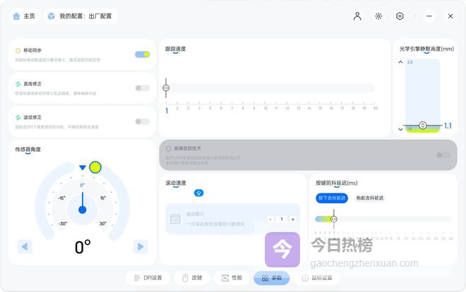 另外它的LOD静默高度可以调节,支持11档可调(1.0-2.0mm,0.1mm步进),跟踪速度,滚动速度,按键防抖延迟等也可以通过驱动软件设置,非常方便。