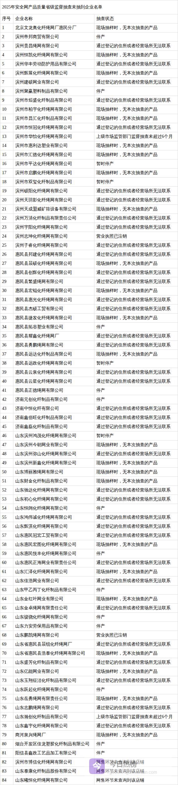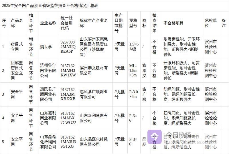 本次抽查发现魏世学、滨州鲁宁网业有限公司(电商)、惠民县广顺网业有限公司(电商)、山东嘉利网业有限公司(电商)、山东晶磊化纤绳网有限公司(电商)等5家销售者销售的5批次产品不符合相关标准的要求,不合格项目为系绳间距及长度、筋绳间距、绳断裂强力、耐冲击性能、耐贯穿性能、耐冲击性能、断裂强力×断裂伸长、开眼环扣强力。