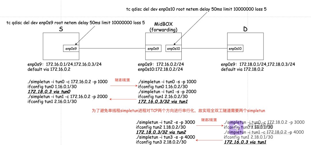 当网络出现多流竞争时,BBR 流可能持续霸占高带宽,而 Reno 流则快速让出资源,前者效率高却可能不公平,后者公平却效率低。历史背景是:TCP Reno 的诞生本就不是为了“跑得快”,而是为了在拥塞爆发时快速收敛、保证公平。如今我们要求它兼顾效率,本质上是让它同时扮演“裁判”与“运动员”。若想回到“无拥塞控制”时代的狂飙突进?只需关闭所有 TCP 控制即可——但代价是网络乱成一锅粥。于是回到现实:公共网络里长肥管道的随机噪声与真实拥塞交织,单流想持续跑高吞吐几乎是个奢望。那么如何在复杂网络里提升效率?答案只有两个字:拆分。把长肥管道切成短瘦段,让每段独立运行拥塞控制,即可绕过“长肥”带来的天然劣势。SDWAN 提供两种思路:TCP Proxy 或 TCP Tunnel。实验如下:### 把长肥管道切成两段——用隧道验证“分而治之”的效果#### 环境搭建继续沿用上面的拓扑,但增加两段隧道:S→T1→T2→D 每段隧道 RTT≈5 ms(本地回环),总路径≈5×2=10 ms(模拟短路径)。拓扑图如下: