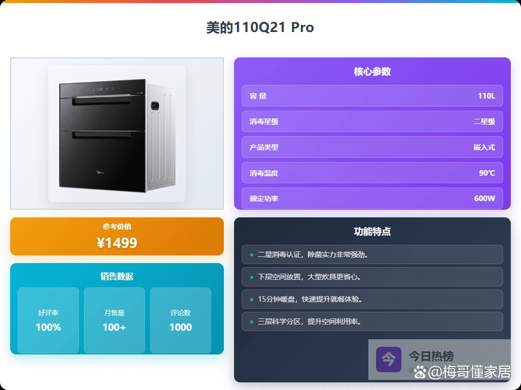 点评:这台美的110Q21 Pro消毒柜确实挺可靠的,全腔采用全不锈钢材质,结构坚固,不怕水汽腐蚀,用起来更安心。它还配备了紫外线杀菌和光波杀菌技术,能深入细菌细胞核,杀灭得更彻底,没有异味残留,餐具用起来也更健康。