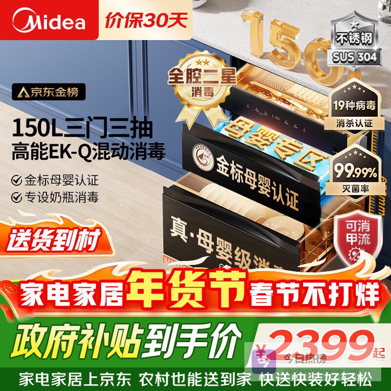 点评:这款美的150B05消毒柜确实挺实用的,容量足够大,能放很多餐具和奶瓶,一家人用着不用担心空间不够,放完还能循环使用,非常方便。它还配备了紫外线、光波和负离子三重杀菌技术,能有效杀灭多达19种细菌,杀菌率达99.99%,让你用得更安心,特别是喂宝宝的餐具,卫生更有保障。