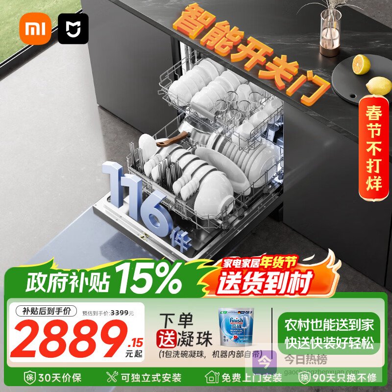 米家小米智能开关门烘干N1三重旋转喷淋大容量150L+一级水效家用独立式全自动独嵌两用洗碗机QMDW¥