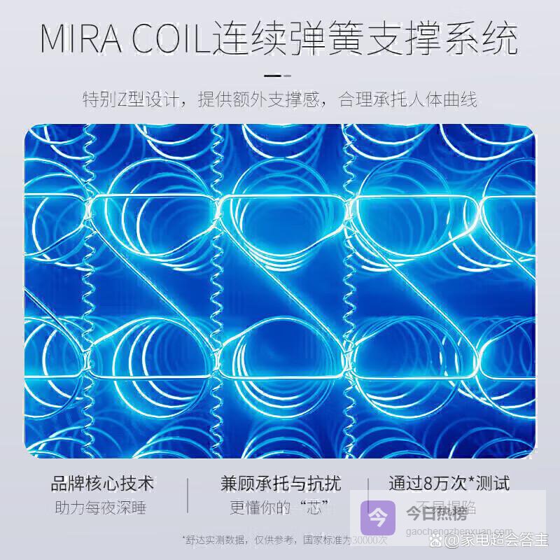 MIRA COIL支撑系统:采用进口乳胶与连续弹簧组合,提供强劲支撑,有效减少夜间翻身干扰,让您享受稳稳的好梦。