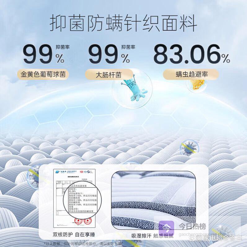 高端抗菌防螨面料:独特的针织面料具备极佳的抗菌防螨能力,为用户提供一个清新安全的睡眠环境,安心无忧。