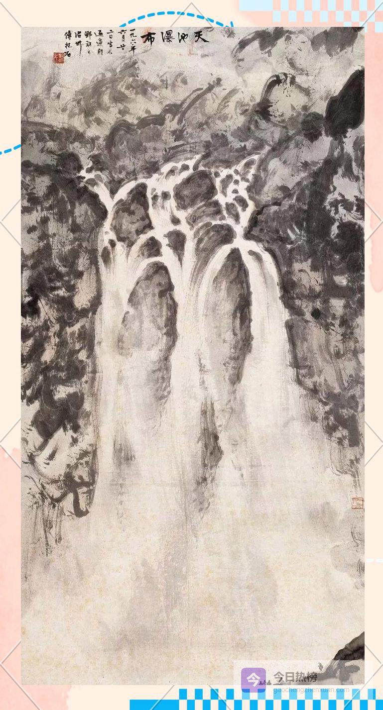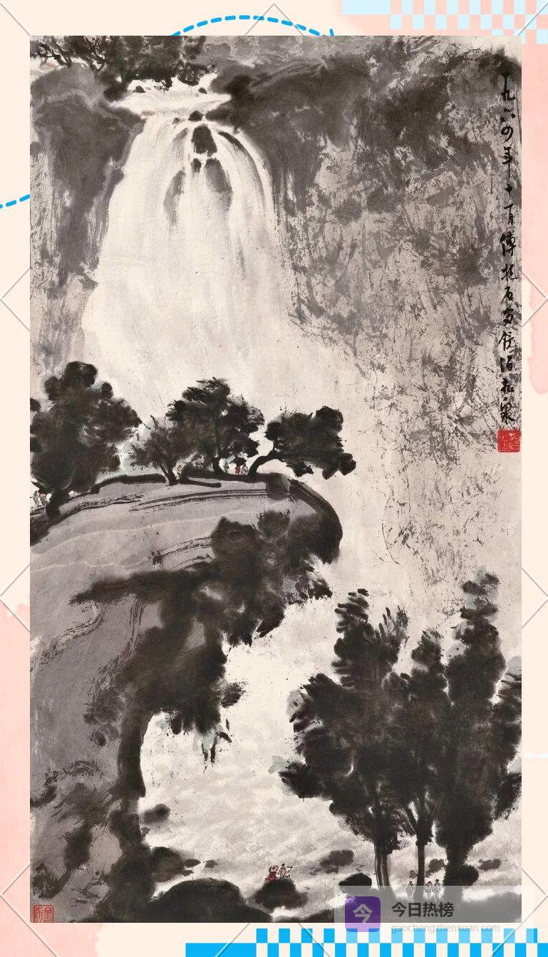 1965 年《镜泊飞泉》里,瀑布被画成一道银色弧线,直插纸背; 墨色层层晕开,像一曲未完成的古琴曲,留给人无尽的余音。