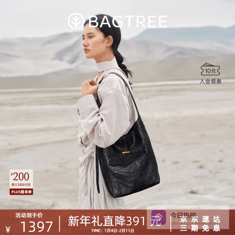 BAGTREE【明星同款】包包树水桶包轻奢品牌新款植鞣皮大容量通勤单肩女包 檀黑色-大号 高级小众生日礼物女¥