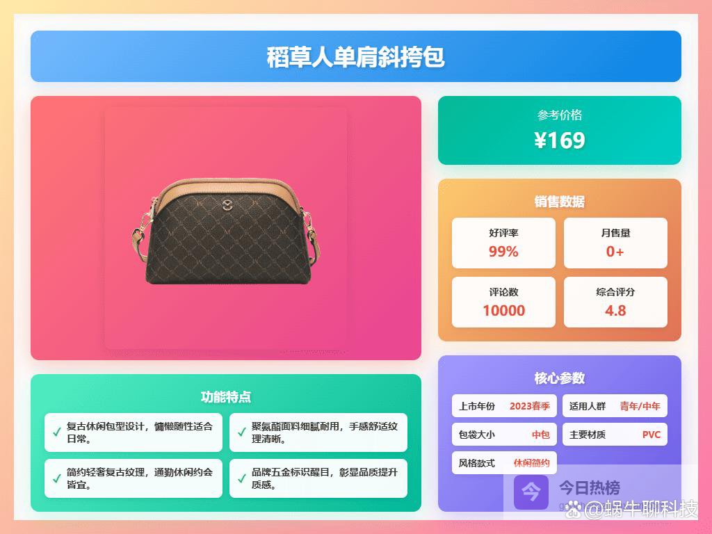 三、稻草人这款稻草人单肩包采用复古休闲包型设计,包体柔软,不易塌陷,散发出一种慵懒的氛围,非常适合日常出行。它的材质为柔软细腻的聚氯乙烯面料,手感舒适且耐用,试用后觉得挺符合实际需求的。包身的纹理自然清晰,看起来质感不错,实测也挺耐用,不会轻易损坏。