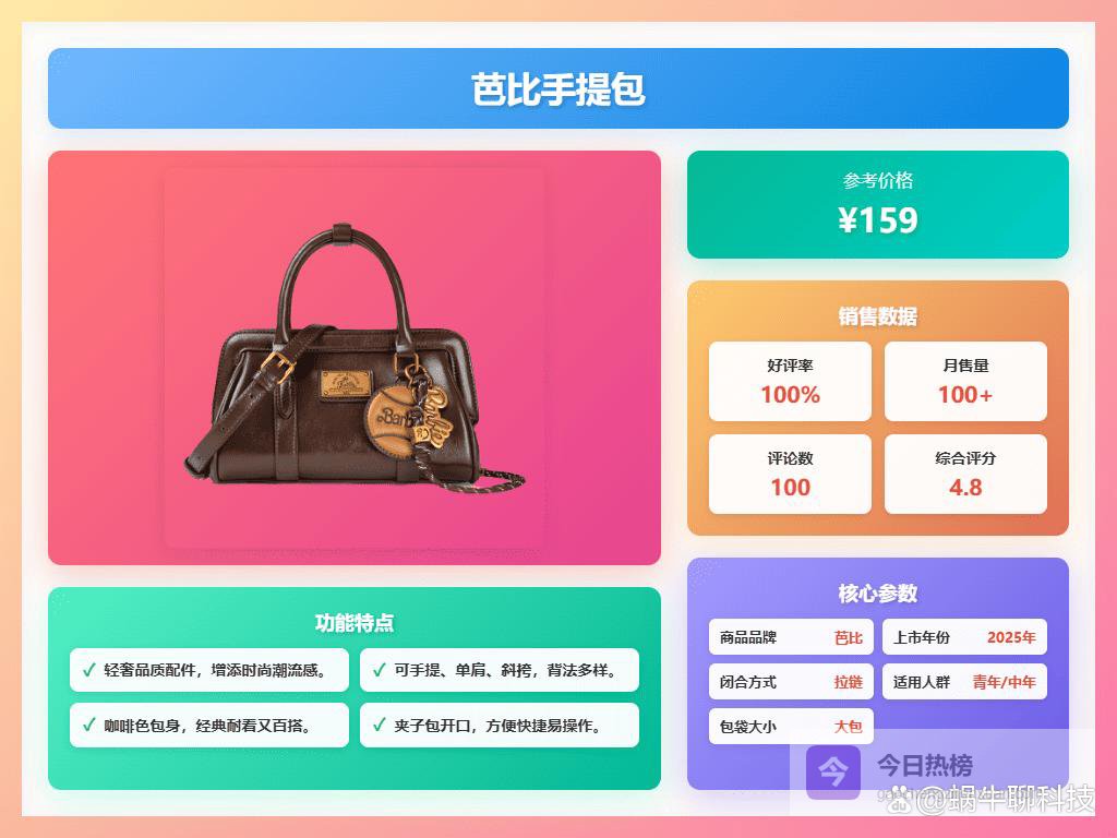 八、芭比这款芭比手提包采用时尚油蜡面料,触感顺滑,兼具耐用与质感。大尺寸设计(24*14*11厘米)刚好能容纳手机、口红、气垫等日常必需品,满足日常出行需求。包包配备单根肩带,方便调整为手提、单肩或斜挎,使用方式多样,挺实用。