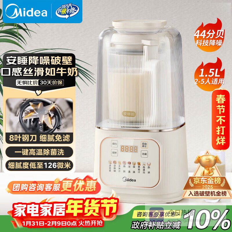 【京东自营】美的安睡破壁机家用1.5L智能降噪全自动免煮豆浆机轻音44分贝多功能五谷杂粮榨汁辅食料理¥
