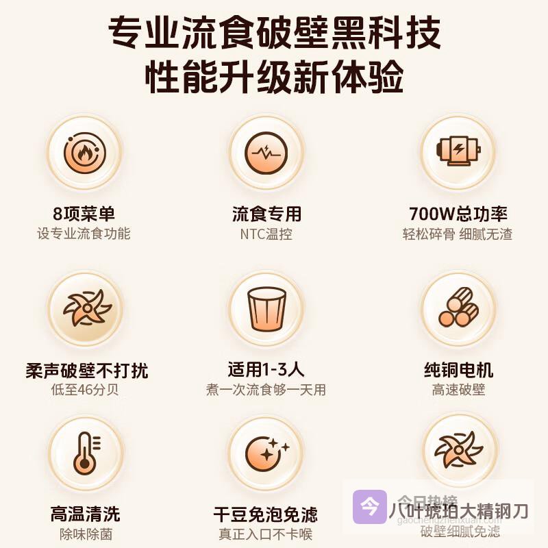 这款设备还配备8叶龙牙刀与新型消音盖,确保每次搅拌都高效且安静。而且,其800W加热功率能快速完成各种饮品的制作。从豆浆到果蔬汁,多达11个功能程序支持,让您随时满足不同口味的需求,让健康饮食变得更加简单。