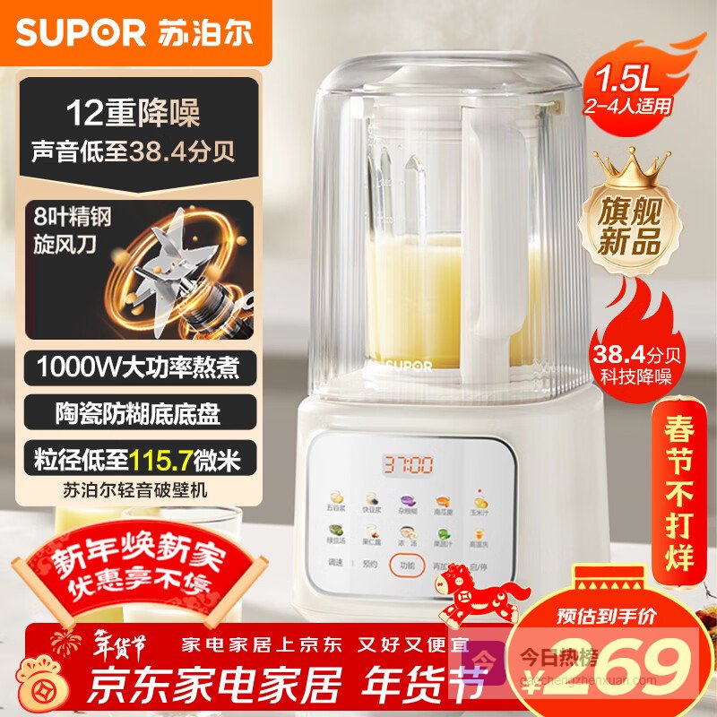 【京东自营】苏泊尔轻音破壁机1.5L低音有罩降噪家用豆浆机预约加热免滤全自动辅食料理机破冰碎冰榨汁机¥