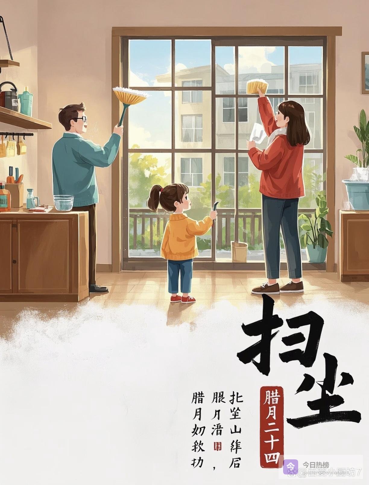 我每年腊月二十都会和爸妈一起扫尘。小时候觉得累,现在长大了,反而觉得这是一种幸福。一家人一起干活,说说笑笑,看着家里从乱糟糟变得干干净净,那种成就感和幸福感,是任何东西都替代不了的。