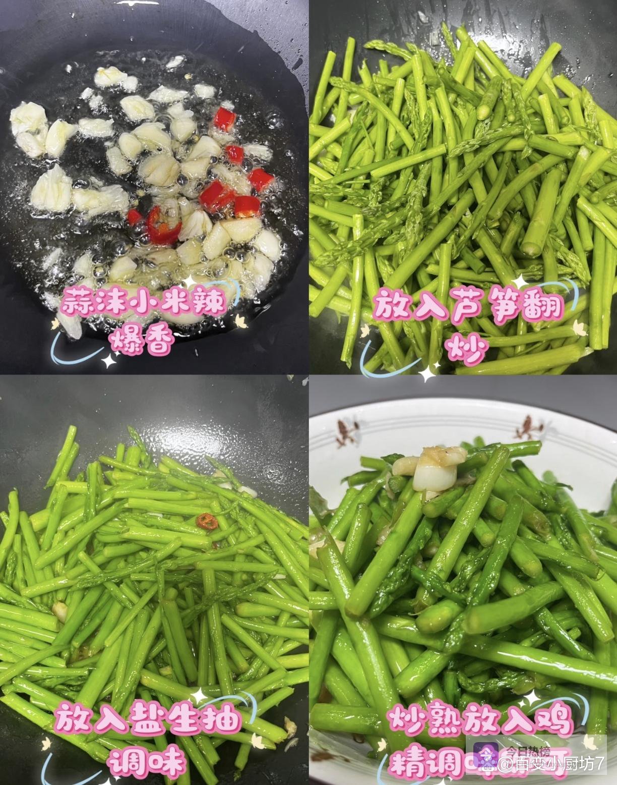 2. 处理食材:芦笋去掉老根,切成段;大蒜切成蒜末;小米辣切成圈。