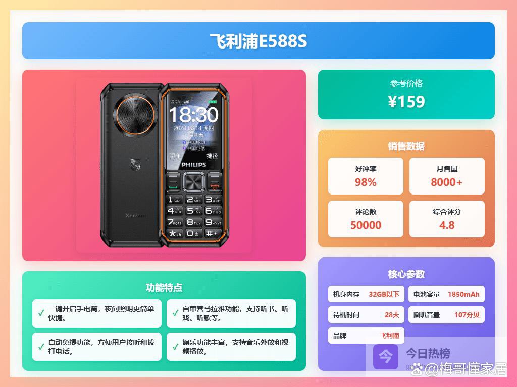 另外,现在很多千元机都在一些细节上做了优化,比如信号增强、防水防尘等等。像OPPO那款, 信号提升两倍,在复杂环境也不怕掉线,对经常出差或者居住在信号不太好的地方的朋友来说,就非常实用。还有像小米,有IP64防水防尘标准,日常使用更安心。此外,给长辈选手机,操作简单、声音大、字体大就非常重要,飞利浦E588S老人手机就是个不错的选择。总而言之,根据自己的实际需求来选择,才能选到真正好用的千元机,千万别盲目跟风。