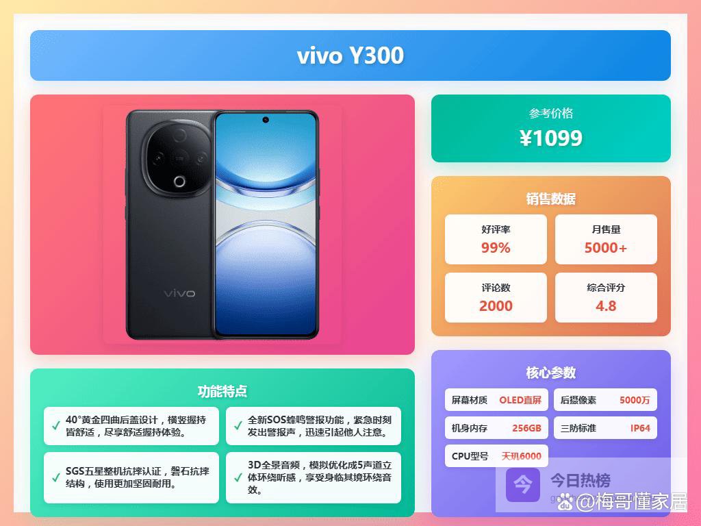 点评:这款 vivo Y300 搭载天玑6000系列处理器,运行速度还算挺流畅的,基本日常用起来没啥压力。8GB的运行内存也够用,打开多应用也不容易卡顿,操作挺顺手。