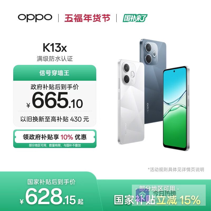 OPPO K13x 6GB+128GB 矅黑 天玑6300 IP69防尘防水 大容量电池 千元老人智能 LCD屏5G手机 国家补贴¥