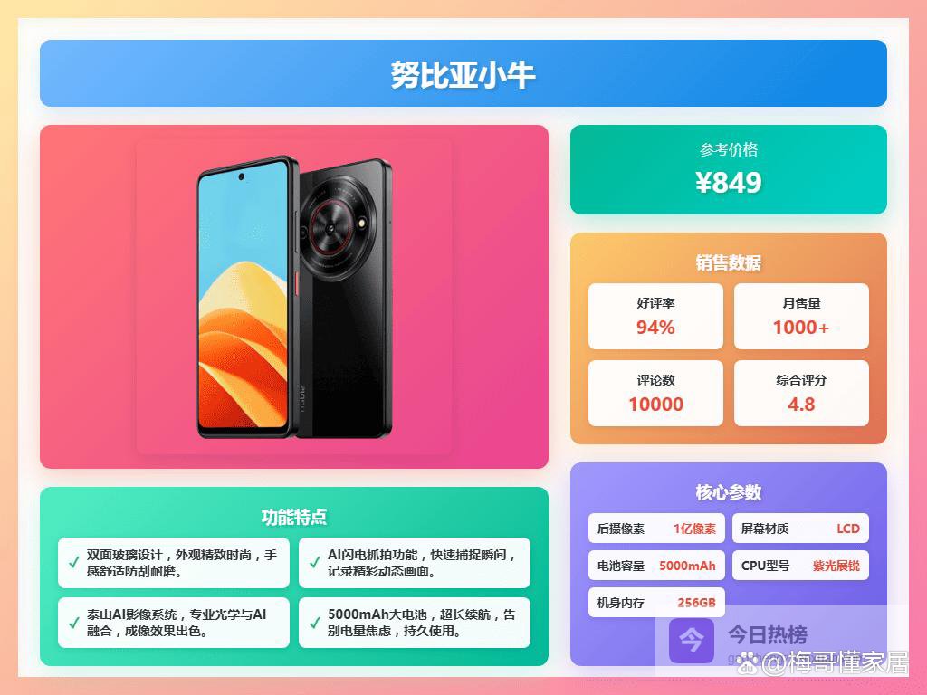 千元机市场现在是越来越卷了,各个品牌都在拼配置、拼设计,想要选到一款真正适合自己的还真得擦亮眼睛。首先,你要明确自己最看重什么,是拍照?续航?还是流畅度? 如果你经常拍照,那就重点关注摄像头参数和优化算法,比如努比亚小牛,它的一亿像素主摄就很能打。如果你是重度手机用户,经常玩游戏或者看视频,那续航就很重要了,像荣耀的这款,7000mAh超大电池能让你告别电量焦虑。还有一点,别光看参数,最好去实体店体验一下,看看手感、屏幕显示效果是不是自己喜欢的。