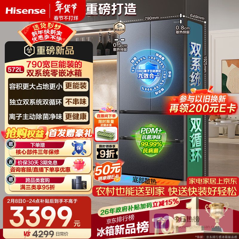 【商品推荐】3:海信572L双系统多门冰箱这款最值得说的是它的双系统双循环+独立除菌模块组合。冷藏和冷冻不仅各自有蒸发器,还分别配了独立的EPP全时净化系统,实时分解异味分子和乙烯气体。草莓放一周仍鲜红发亮,切开的西瓜第三天依然清甜多汁,不是靠低温硬压,而是从源头掐断变质路径。