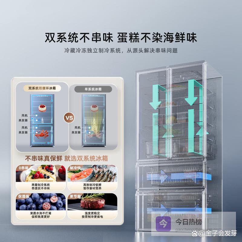 双系统≠双蒸发器,双循环才是硬门槛。单系统强行分冷区,冷藏室开门时冷气直灌冷冻室,温度反复波动,冻肉表面容易起霜、蔬菜蔫得快。真双循环能让冷藏和冷冻各自控温,互不干扰,保鲜稳定性直接拉高一个段位。