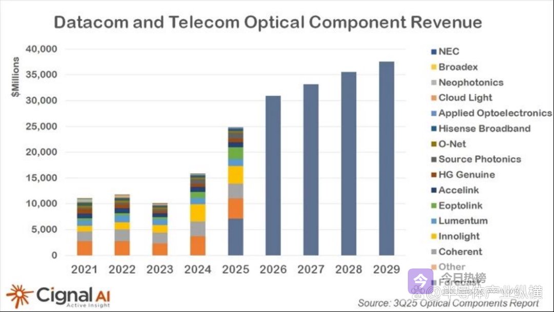 市场研究机构Cignal AI报告显示,2025年光器件市场营收将创历史新高,数通板块的营收预计超过180亿美元,相干光模块营收则达到近60亿美元。从2024年到2029年,数通光模块市场营收预计将以超过20%的复合年增长率持续增长,到预测期末将达到近290亿美元。