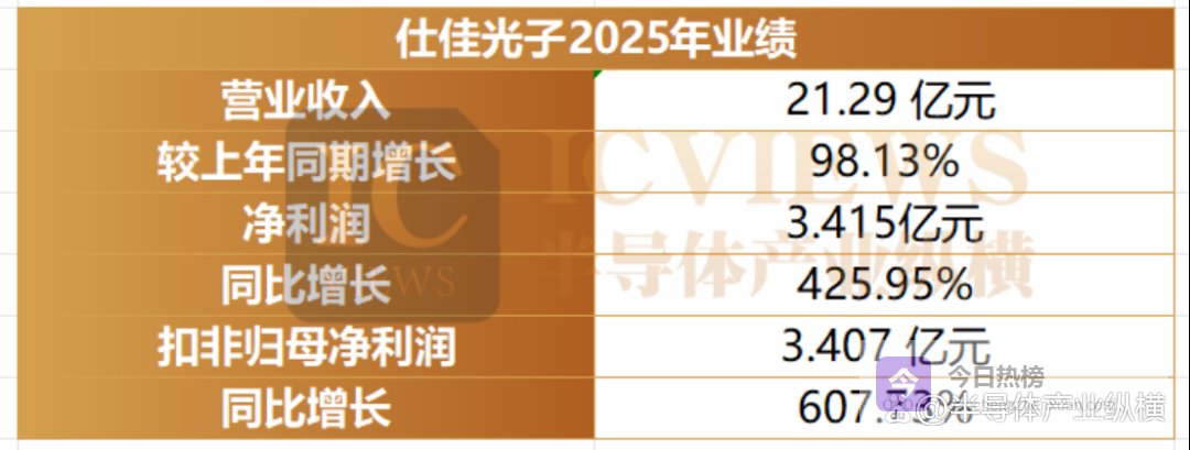 业绩预告显示,仕佳光子 2025 年预计实现营业收入约 21.29 亿元,同比增幅达 98.13%;归属于上市公司股东的净利润 3.415 亿元,同比飙升 425.95%;扣非归母净利润 3.407 亿元,增幅高达 607.73%。据公告披露,上年同期公司营收为 10.7453 亿元,归母净利润 6493 万元,扣非归母净利润 4814 万元,2025 年各项核心财务指标均实现翻倍式增长(业绩数据为公司财务部门初步测算结果)。